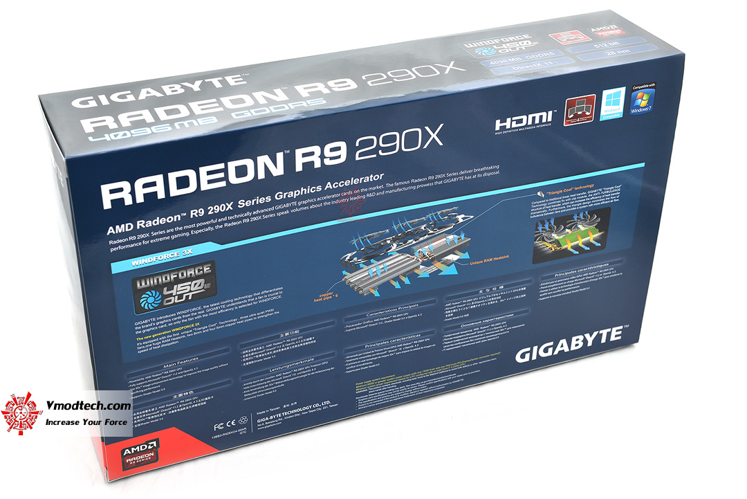 กล่องบรรจุ GIGABYTE Radeon R9 290X WINDFORCE 3X ยังเป็นโทนสีนี้เช่นเคย แต่อาจจะแปลกตาซักนิดกับรายละเอียดบนหน้ากล่องที่แอบมีสีแดงแต้มมาเล็กๆตรงขวาล่างครับ