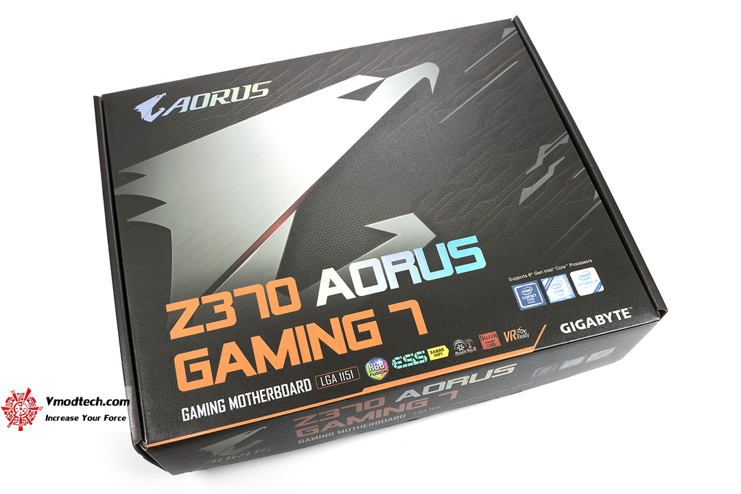 กล่องบรรจุ GIGABYTE Z370 AORUS Gaming 7 นั้น จะมีขนาดไม่ใหญ่มากนะครับ สีสรรออกแบบมาด้วยโทนสีดำตัดกับสีส้มจี๊ดๆๆ ทั้งด้านหล้าและด้านหลังกล่องมีการนำเสนอรายละเอียดของบอร์ดเอาไว้เยอะและครอบคลุมคุณสมบัติเด่นของบอร์ดนี้อย่างครบถ้วน