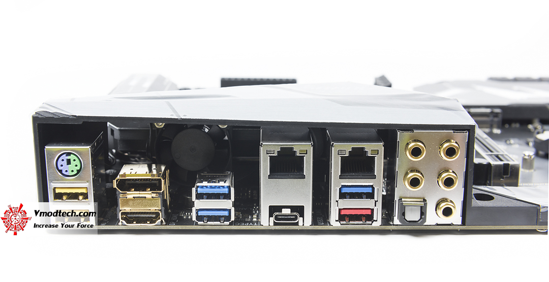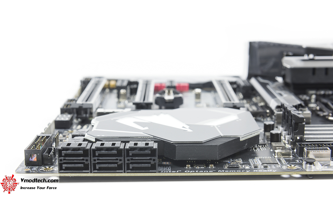 บริเวณสล๊อด PCIe ครับ ซึ่งสล๊อดแบบ 16X จะมีมาให้สามช่อง และแบบ 1X อีกสามช่อง ความสามารถในการเสียบใช้งานกราฟฟิกการ์ดที่ขึ้นอยู่กับเลนของ CPU ที่ใช้งาน และนอกจากนั้น บริเวณนี้จะเห็นพอร์ทการเชื่อมต่อแบบ M.2 ซึ่งมีมาให้สามช่องโดยที่จะมีฮีทซิ้งค์แถามมาให้หนึ่งชิ้น