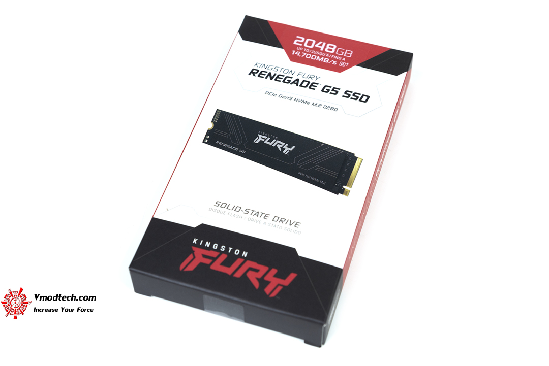 แพกเกจ Kingston FURY Renegade G5 PCIe 5.0 NVMe M.2 SSD นั้นมาในกล่องขนาดเล็กสีสรรโทนดำตัดกับสีแดง