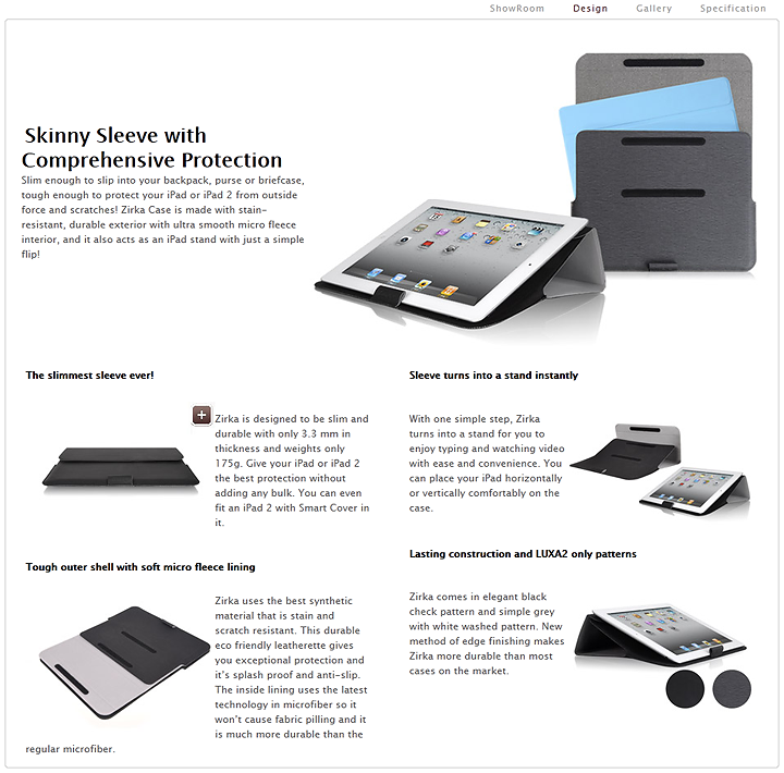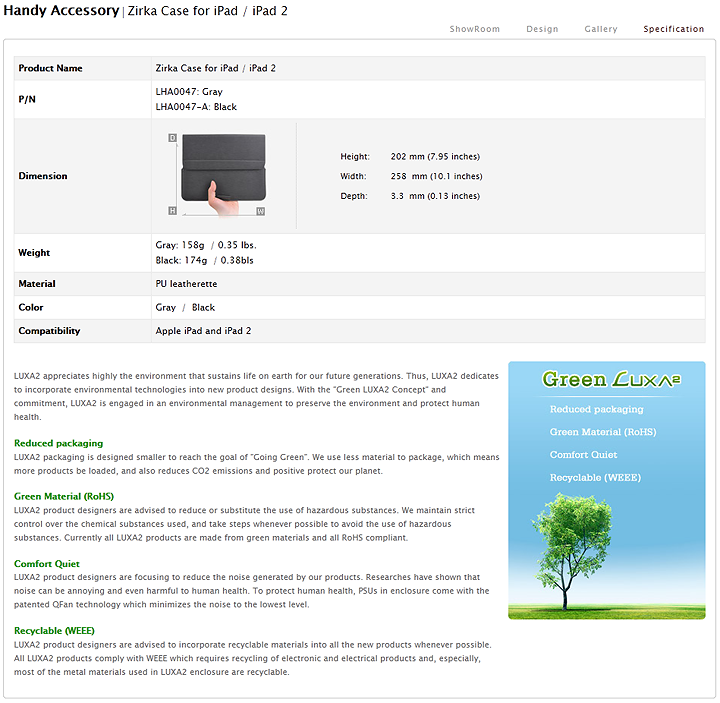 . main1สวัสดีกันอีกครั้งในช่วงกลางสัปดาห์ครับ วันนี้ผมนำเอาเคสสำหรับ iPad จาก LUXA2 อีกรุ่นนึงมาแนะนำ รุ่นนี้มีชื่อว่า Zirka Case for iPad/iPad 2 ครับ ความสวยงามนั้นก็คงไม่ต้องบรรยายอะไรมากนัก เพราะว่ามันได้รับการออกแบบโดย LUXA2 นั่นเอง ซึ่งสไตล์การออกแบบนั้น อย่างที่ผมเองได้เคยรีวิว product หลายๆตัวมาแล้ว ก็จะเห็นว่าจุดยืนของ LUXA2 นั้นก็คือความเรียบง่ายแต่ดูหรูหรา น่าเป็นเจ้าของเป็นที่สุดครับ ไม่พูดมากครับรับชมกันได้เลย LUXA2 Webpage 1-18-2012-1-41-21-pm1-18-2012-1-42-05-pmน้ำหนักเบา และกรีนดีไซน์ที่ดูแลสภาพแวดล้อมไปด้วยคือหลักของการดีไซน์ของ LUXA2 นั่นเอง .
