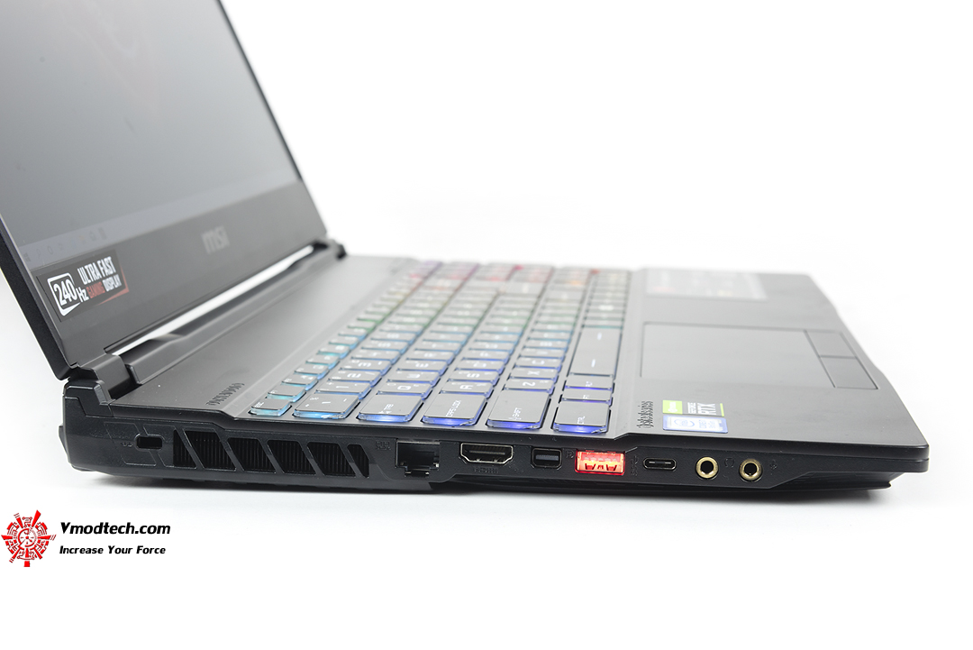 ด้านข้างซ้ายมือของตัวโน๊ตบุ๊คจะเป็นช่องที่เจาะมาเพื่อจะระบายความร้อนอุปกรณ์ภายใน ถัดมาจะเป็นช่องเสียบสายแบน พอร์ดวีดีโอเอาท์พุทแบบ HDMI ที่สามารถปล่อยความละเอียด 4K ที่ 60 Hz และ Mini DisplayPort, USB 3.2 เจน 2 Type A และ Type C อย่างละช่อง และขวาสุดในรุปจะเป็นช่องเสียบหูฟังและไมค์ครับ