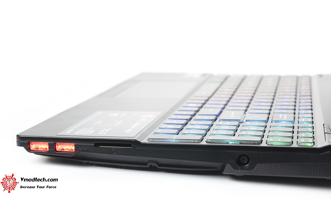 ที่ด้านข้างขวามือของโน๊ตบุ๊คนั้น จากซ้ายมือจะเป็น USB 3.2 Gen 2 Type A สองช่อง และ พอร์ดการ์ดรีดเดอร์ และขวาสุดนั้นนั้นจะเป็นช่องเสียบไฟเลี้ยงเข้าเครื่อง