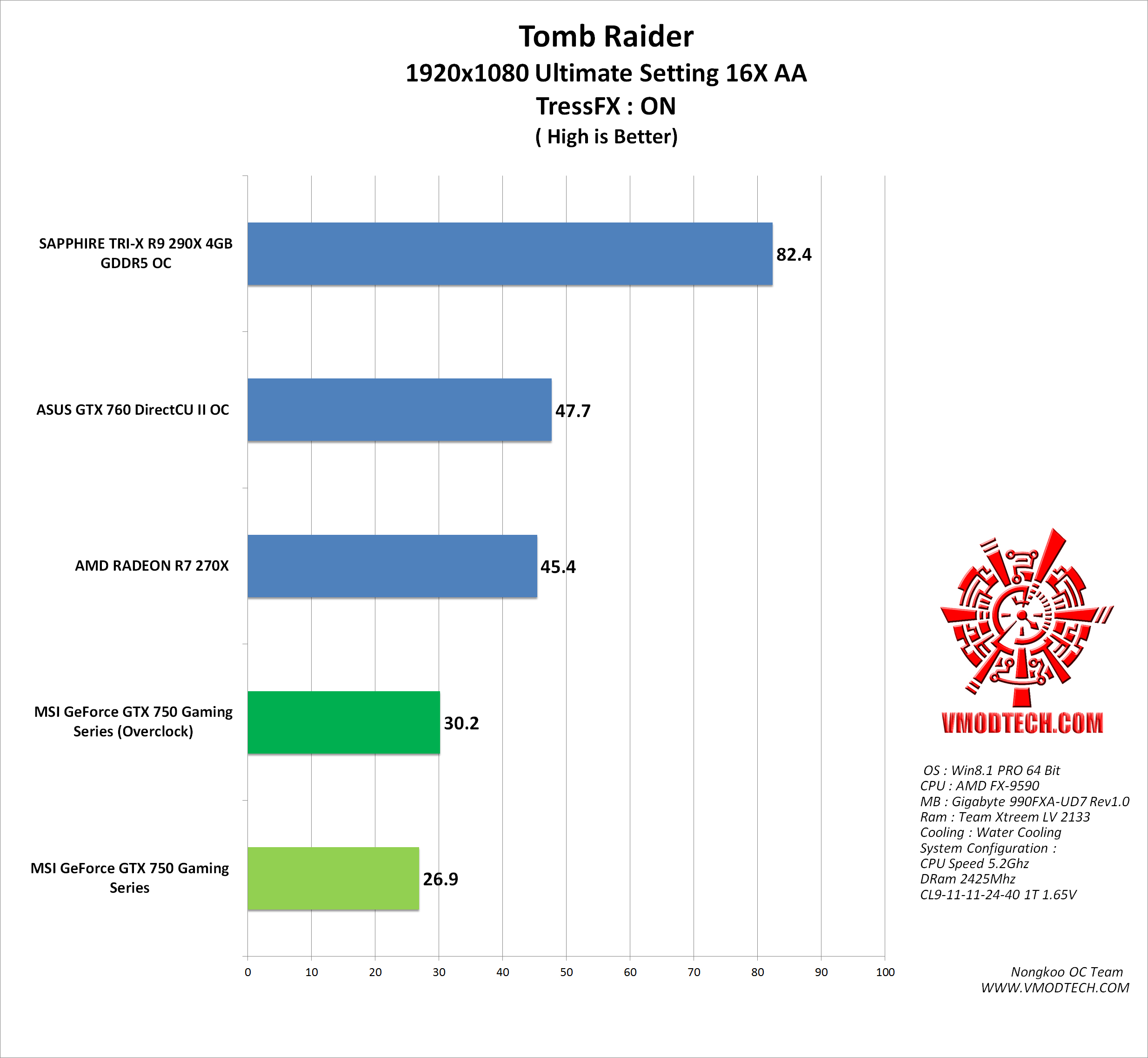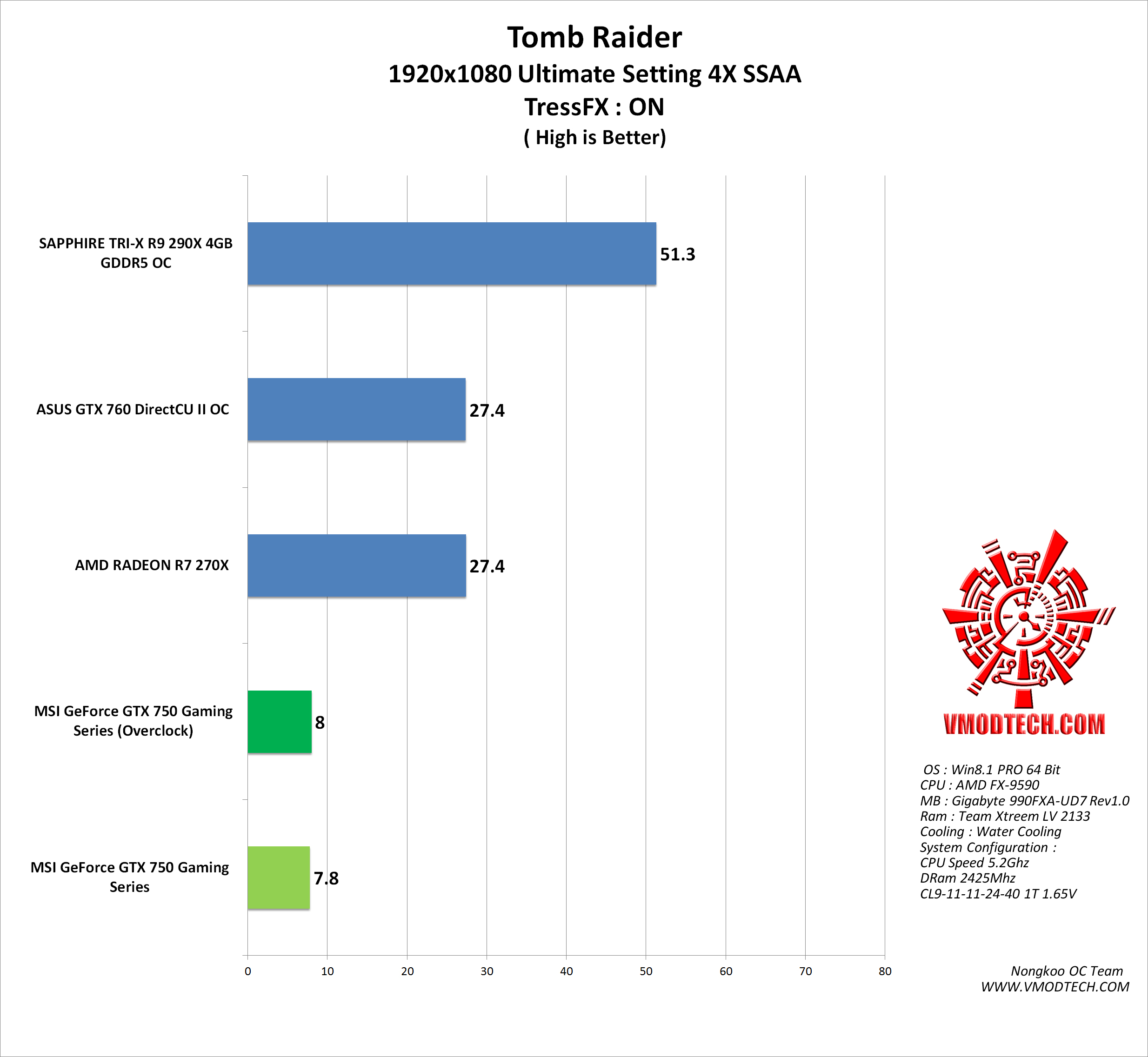 สำหรับ Tomb Raider เปิดในโหมด Ultimate TressFX ON FXAA แบบสุดหมด 30เฟรมเรตครับ ส่วนถ้าเปิด MSAA 4X แบบเต็มๆอยู่ที่ 8เฟรมเรต ใช้งานจริงควรลดรายละเอียดลงมาให้เหมาะสมเล่นได้ลื่นแน่นอนครับ
