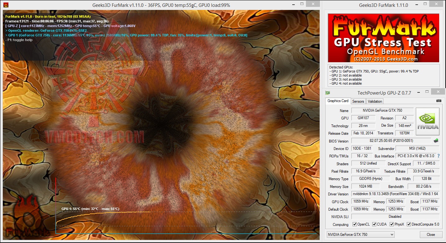อุณหภูมิของการ์ดขณะ Furmark นั้นจะอยู่ที่ไม่เกิน 55 องศา รอบพัดลมออโต้ 35 เปอร์เซนต์ตามโหมดการทำงานปกติ เงียบเหมือนไม่ได้เปิดใช้งานเลย
