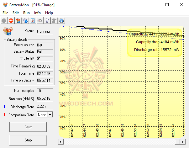 ระยะเวลาการใช้งานระบบที่จำลองโดย BatteryMon ด้วยแบตเตอรี่นั้นจะอยู่ที่ประมาณ 5-5 ชั่วโมงครึ่งได้ครับจากการทดสอบด้วย Battery Mon
