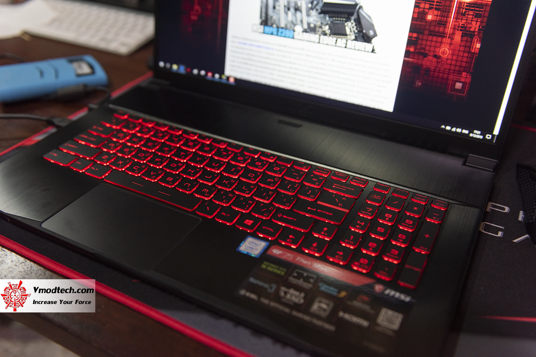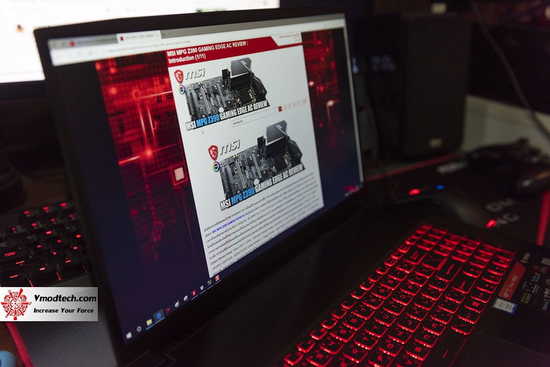 เมื่อลองใช้งานเจ้า MSI GF75 Thin 9SC จอภาพสวยสดใส ชัดเจน คอนทราสดีมาก สีก็ตรงดีเลยครับ บริเวณคีย์บอร์ดนั้นจะเห็นไฟเด่นชัดมากด้วยสีแดง และเมื่อมองจากด้านข้างก็จะเห็นได้ครับว่าแสงสีและความคมชัดแทบจะไม่เพี้ยนเลย