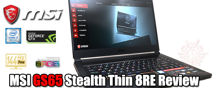 MSI GS65 Stealth Thin 8RE โดยเป็นเกมส์มิ่งโน๊ตบุ๊ครุ่นแรกของโลกที่รองรับการทำงานของหน้าจอแบบ 144Hz 7ms ขนาดหน้าจอ 15.6" มีความบางของส่วนขอบเพียงแค่ 4.9mm เท่านั้น ด้วยดีไซน์ของตัวเครื่องที่เน้นความบางเบาที่ฉีกกรอบเดิมๆของโน๊ตบุ๊คเกมส์มิ่งที่ต้องใหญ่แต่สำหรับ MSI GS65 Stealth Thin 8RE เน้นความปราดเปรียวพกพาง่ายครับ สเปกมาพร้อมขุมพลัง Intel Core i7 8750H ซีพียูอินเทลในรุ่นที่ 8th GEN ใหม่ล่าสุด 6/12คอร์กันเลยครับ กราฟฟิการ์ดจัดเต็มด้วย Nvidia GTX 1060 6GB ตัวแรงพร้อมจัดเต็มทุกเกมส์และรองรับการใช้งานทั่วไปได้สบายๆครับ ด้วยฟีเจอร์ที่ให้มามากมายไม่ว่าจะเป็น COOLER BOOST TRINITY , MATRIX DISPLAY , True Color 2.0 , Hi-Res audio , Dynaudio , Nahimic 3 , Nahimic VR , Per-Key RGB , DRAGON CENTER 2.0 , SteelSeries Engine 3 , Killer E2500 , Killer Shield , และอื่นๆอีกมากมายครับ และที่สำคัญแบตเตอรรี่ที่สามารถใช้งานได้ยาวนานถึง 8ช.ม. กันเลยทีเดียวครับ ในวันนี้ทดสอบแบบจัดเต็มให้ท่านได้ชมกันเช่นเคยครับ แต่ก่อนอื่นเราไปชมรายละเอียดฟีเจอร์จากทางเว็บไซต์ของ MSI GS65 Stealth Thin 8RE กันก่อนสักเล็กน้อยครับ