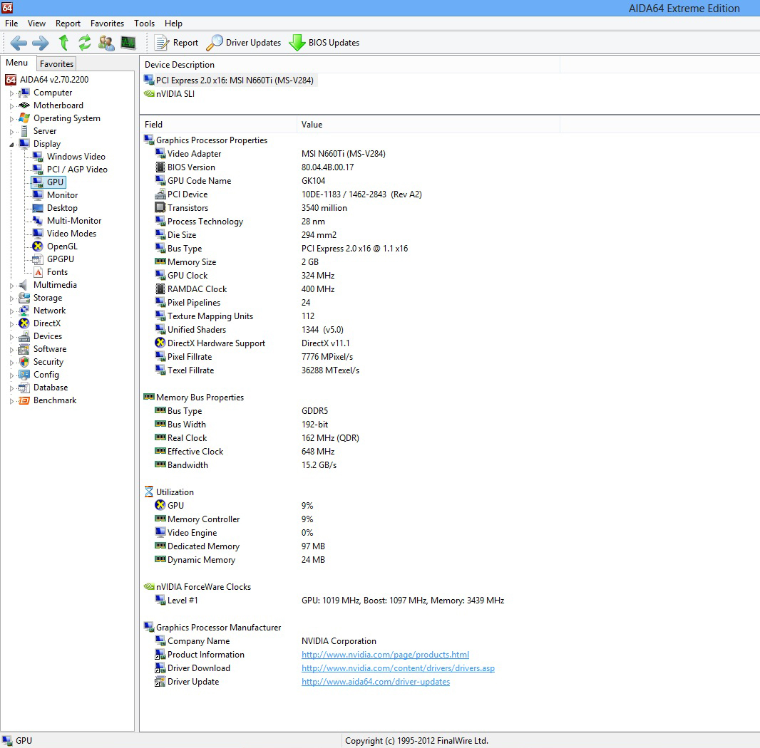 รายละเอียดของการ์ดจอ MSI GTX660 Ti POWER EDITION 2GB DDR5 OC EDITION จาก AIDA64 และ Nvidia System Information