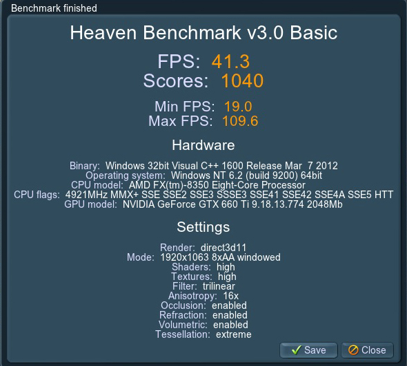 Unigine Heaven 3.0 ผมพยามปรับภาพให้ได้ความละเอียด 1080P แต่มันได้เท่านี้ไม่แน่ใจว่าเป็นกับไดร์เวอร์หรือซอฟแวร์ตัวไหนนะครับเพราะผมทดสอบเสร็จวันต่อมาออกเวอร์ชั่นใหม่มาเลย อิอิ กำ มันจึงออกมาเป็น 1063P ไปได้ ต้องกราบขออภัยด้วยครับหรือตัวโปรแกรมมันโชว์ผิดอันนี้ก็ไม่ทราบครับผม แต่เฟรมเรตก็พุ่งกระฉูดทะลุ 41.3เฟรมเรตกันไปเลยครับ แรงจริงๆ เปิดแบบสุดหมดทุกอย่าง