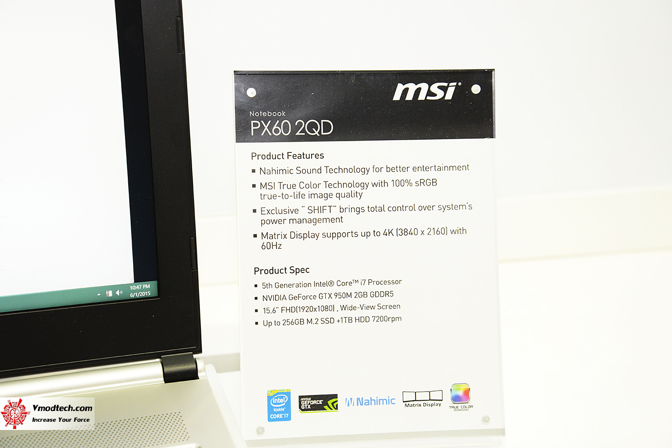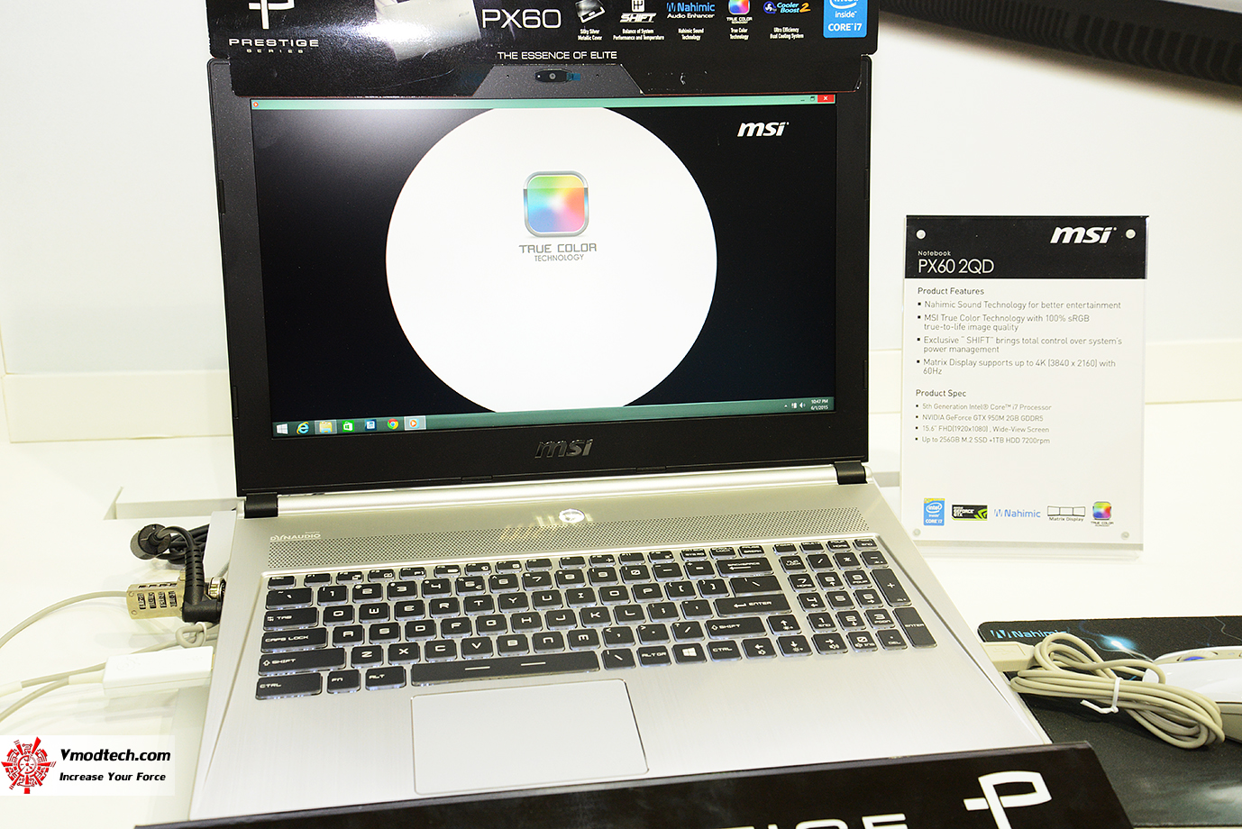 สวัสดี ครับ ทุกๆท่านที่เยี่ยมชมเว็บไซต์ Vmodtech.com วันนี้ผมมีพรีวิวต่อเนื่องจากบทความ MSI BOOTH @ COMPUTEX TAIPEI 2015 ที่ได้กล่าวกับทุกๆท่านว่าจะนำเสนออุปกรณ์ใหม่ๆของทาง MSI แบบต่อเนื่องพรีวิวถึงรายละเอียดต่างๆให้ทุกๆท่านได้รับชมกัน โดยวันนี้ผมจะนำโน๊ตบุ๊คตัวใหม่ล่าสุดของ MSI มาพรีวิวให้ท่านได้ชมกันนั่นก็คือรุ่น MSI PE60 2QE / PX60 2QD ซึ่งในรุ่นนี้เป็น PRESTIGE SERIES ของทาง MSI โดยมีจุดเด่นที่ฟีเจอร์ก็คือ MSI True Colour Technology กล่าวคือแสดงผลได้ตรงกับภาพต้นฉบับจริงๆโดยท่านจะไม่ประสบปัญหาภาพเพี้ยน ในการทำงานออกแบบแต่งรูปภาพต่างๆ ซึ่งออกแบบมาให้เหมาะสมกับบรรดานักออกแบบหรือตกแต่งรูปภาพหรือใช้งานด้านกราฟฟิก 3D ออกแบบอื่นๆนั่นเองครับ เดี๋ยวเราไปชมกันครับว่า PRESTIGE SERIES ของทาง MSI รูปร่างหน้าตาเป็นเช่นไรบ้าง