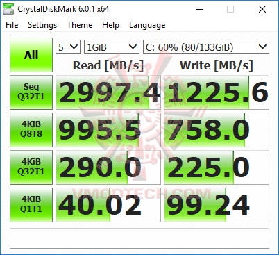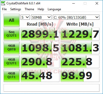 ความเร็วในการอ่านนั้นเร็วมากครับอยู่ที่เฉลี่ยประมาณ 2900-3000 เมกกะไบท์ต่อวินาที รวมถึงความเร็วในการเขียนก็อยู่ตามสเปกที่ประมาณ 1200 เมกกะไบท์ต่อวินาที