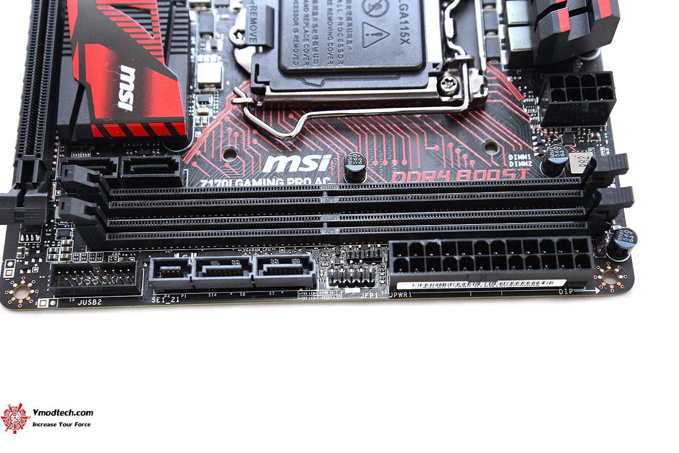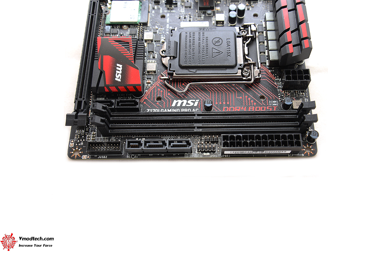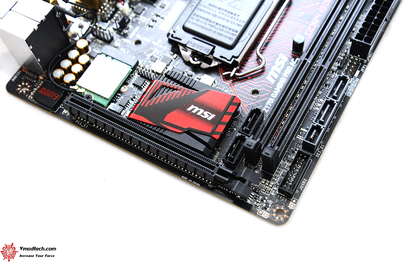 สล๊อตแรมมีด้วยกัน 2ช่องครับ รองรับ Supports DDR4 4200(OC)/4000(OC)/3866(OC)/3600(OC)/3200(OC)/ 3000(OC)/ 2800(OC)/ 2600(OC)/ 2400/ 2133 MHz ความจุ 32GB ครับ และยังมีเทคโนโลยี MSI DDR4 Boost technologyที่ช่วยเพิ่มประสิทธิภาพการทำงานของแรมและช่วยในเรื่องเสถียรภาพการทำงานอีกด้วยฮีตซิงค์ชิบเซ็ต Intel® Z170 Express Chipset เป็นฮีตซิงค์ที่ออกแบบมาเป็นพิเศษในชื่อ GAMING Heatsink ครับ ด้วยความสวยงามกอรปกับการระบายความร้อนที่ยอดเยี่ยมไม่ใช่สวยแต่ภายนอกเพียงอย่างเดียว ส่วนสล๊อต 1 x PCIe 3.0 x16 slots ให้มา 1ช่องครับ ส่วนช่อง SATA ต่างๆให้มากัน 4 x SATA 6Gb/s ports , 1 x M.2 slot อยู่ด้านหลังเมนบอร์ดครับและ 1 x SATAe port (PCIe 3.0 x 2)