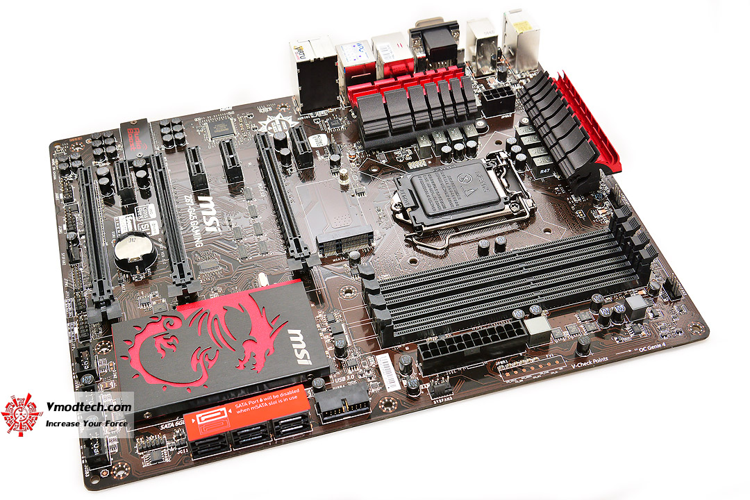 หน้าตาของมาเธอร์บอร์ดรุ่นนี้ จะออกแนวเข้มขรึมดำคาดแดงดุดัน ตามคอนเซปต์บอร์ดตระกูลมังกรแดงเกมมิงของ MSI ครับ
