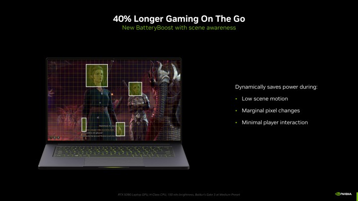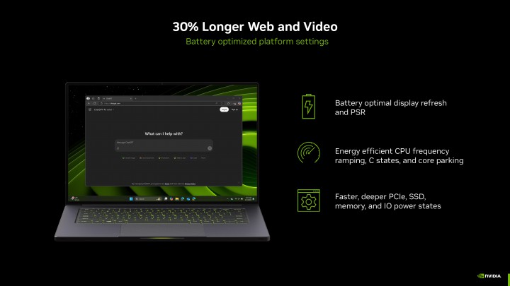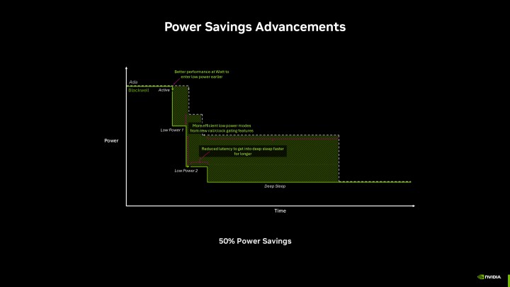 บรรดาแล็ปท็อปรุ่นใหม่ที่ใช้การ์ดจอ Nvidia GeForce RTX 50ซีรี่ย์จะมีระบบ Power Saving Advancements ระบบประหยัดพลังงานแบบใหม่มาช่วยจัดการในเรื่องของพลังงานเป็น 3ระดับที่ช่วยเซฟได้มากถึง 50% มีใช้งานเฉพาะในแล็ปท็อป RTX 50ซีรี่ย์เท่านั้นครับ