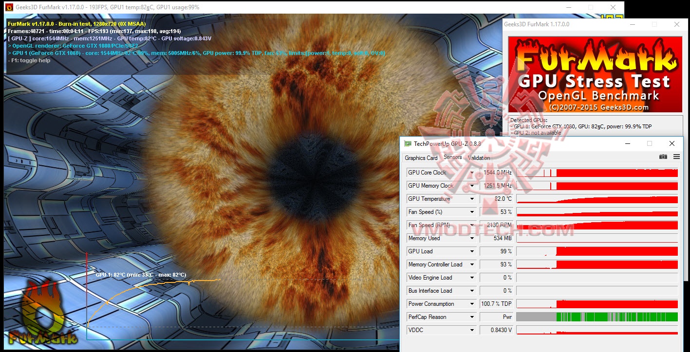 ทดลองโอเวอร์คล๊อกเพิ่มขึ้นไป ก็พอไปได้อีกพอควรครับและไปจบที่ GPU Clock +200 และ MEMORY CLOCK + 628 MHz จะได้ความเร็วที่ประมาณ 1807/1879 Core/Mem