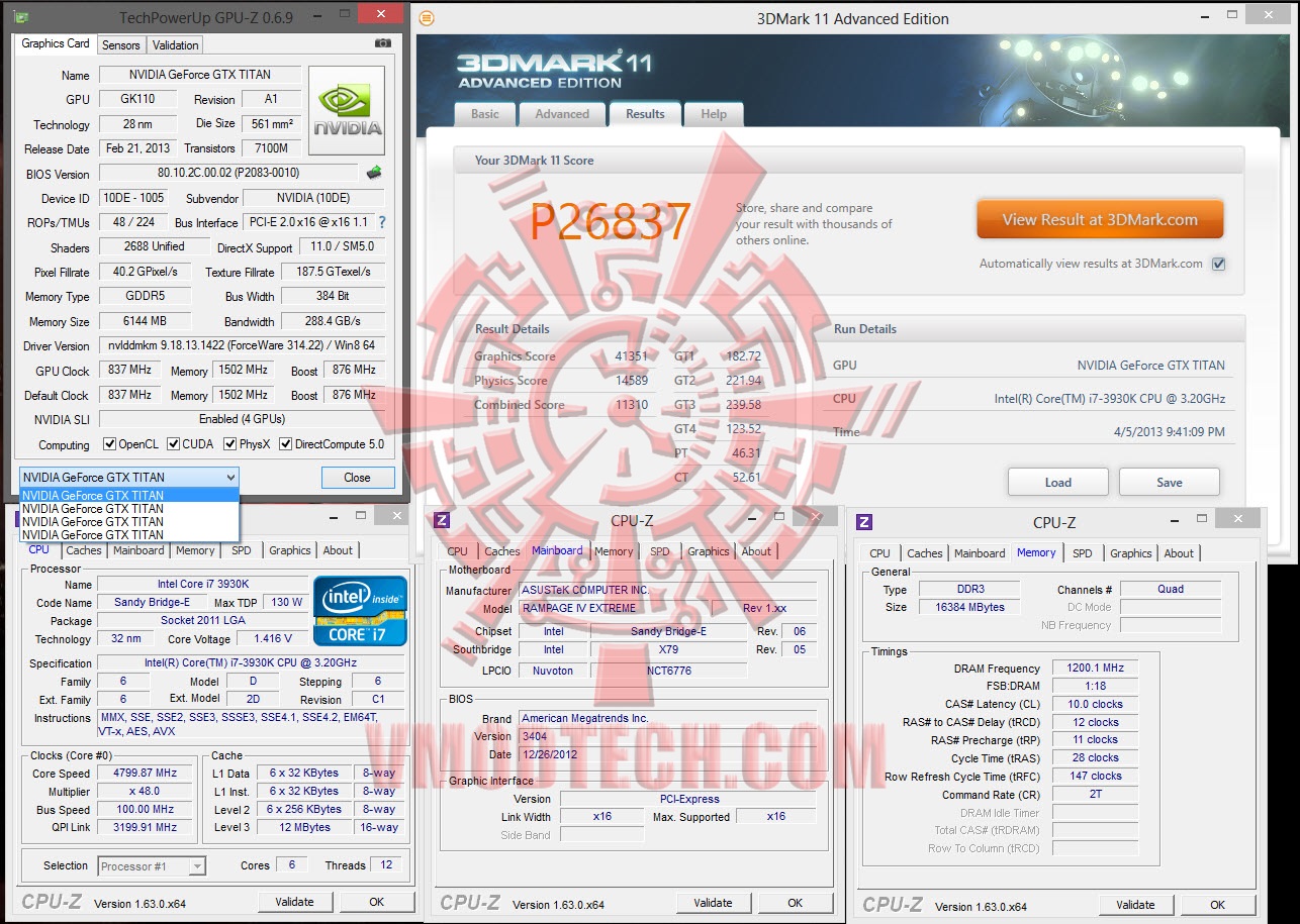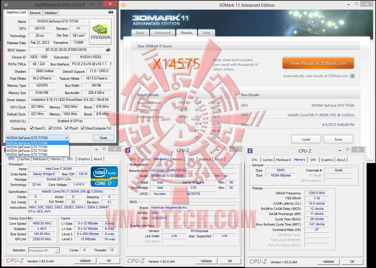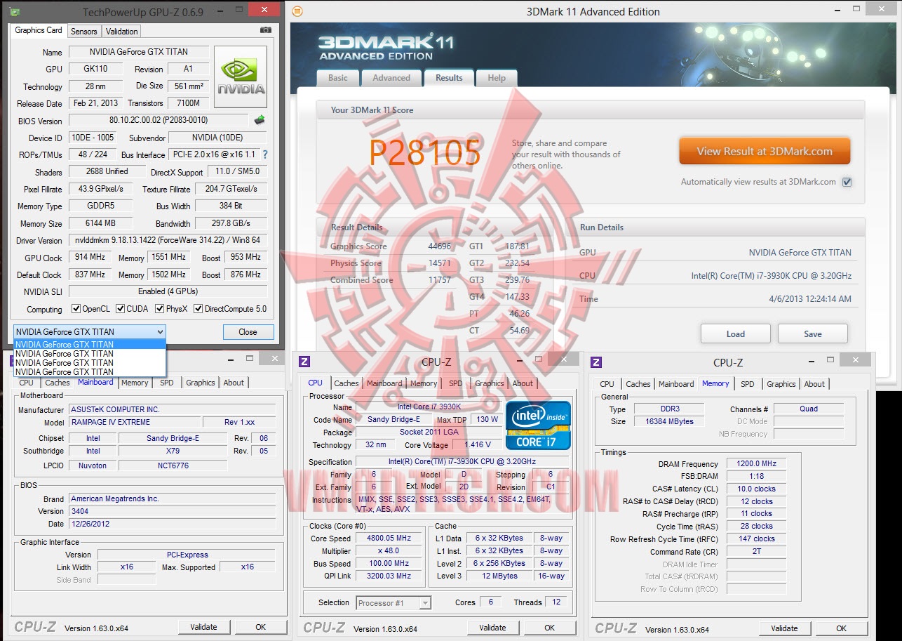 NVIDIA GeForce GTX TITAN 4-Ways SLI Overclock stage @ 914/1551/953 Core/Mem/Boost from GPUZ