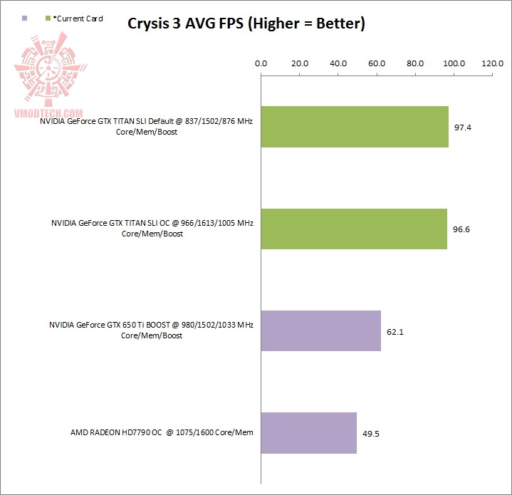 มาถึงสุดยอดเกมส์กินสเปกอย่าง Crysis 3 การ์ด TITAN SLI นั้นเล่นได้แบบไม่สะทกสะท้านแต่อย่างใดครับ เฟรมเรทตามการตั้งค่าด้านบนนั้นเกือบๆร้อยเฟรมต่อวินาที นอกจากนั้น ผมได้ลองปรับค่าในเกมส์เป็น Very High แล้ววัดเฟรมเรทดู โหดไม่ใช่ย่อยด้วยเฟรมเรทแทบไม่ตกเลยครับ ที่ Default นั้นเล่นได้ที่ 73.2 FPS ส่วนหลัง Overclock นั้นเล่นได้ที่ 80 FPS สมแล้วครับเป็นการ์ดที่แรงที่สุด