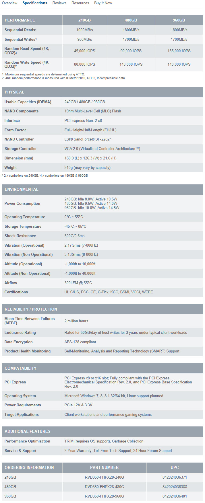 OCZ RevoDrive 350 PCI Express SSD 480GB นั้นมี interface การเชื่อมต่อแบบ PCI Express แล้ว Bridge เป็น SATA 6Gb/s หรือ SATA-3 ครับและมีขนาด 2.5 นิ้ว ใช้ NAND MLC Flash ขนาด 19nm จากแบรนด์ Toshiba และใช้คอนโทรลเลอร์ Sandforce SF-2282 (LSI) ในการควบคุม SSD ครับ มีให้เลือกซื้อหาใช้งานสามความจุคือ 240, 480, 960GB ครับ