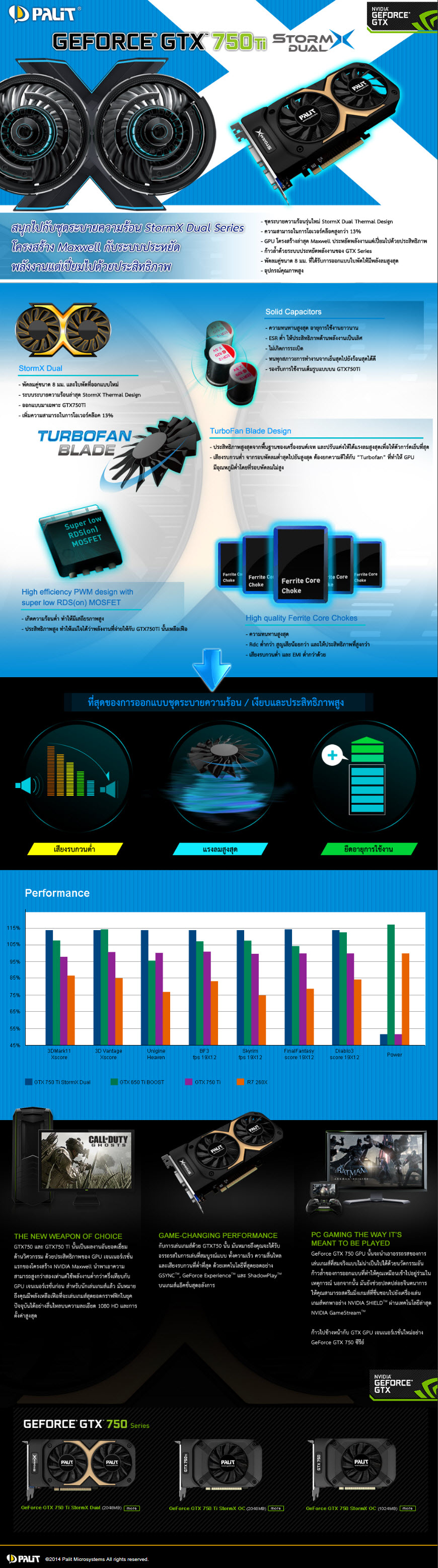 PALIT GeForce GTX 750 Ti Dual StormX นั้นเป็นการ์ดที่ใช้ GPU NVIDIA GeForce GTX 750 Ti แต่ว่าตัวการ์ดจะได้รับการปรับแต่งให้มีความเร็วสูงกว่ามาตรฐานการ์ดจาก NVIDIA และมีชุดระบายความร้อนที่มีประสิทธิภาพมากที่สุดในซีรีย์นี้ ซึ่งจริงๆแล้วในซีรีย์ก็จะมีรุ่นที่ใช้ GPU ตัวเดียวกัน แต่ว่าลดความเร็ว GPU และชุดระบายความร้อนที่ต่างออกไป ทำให้ราคาขายนั้นมีหลากหลาย เราสามารถเลือกได้ตามความต้องการของกำลังจ่ายของเราได้เป็นอย่างดีครับ
