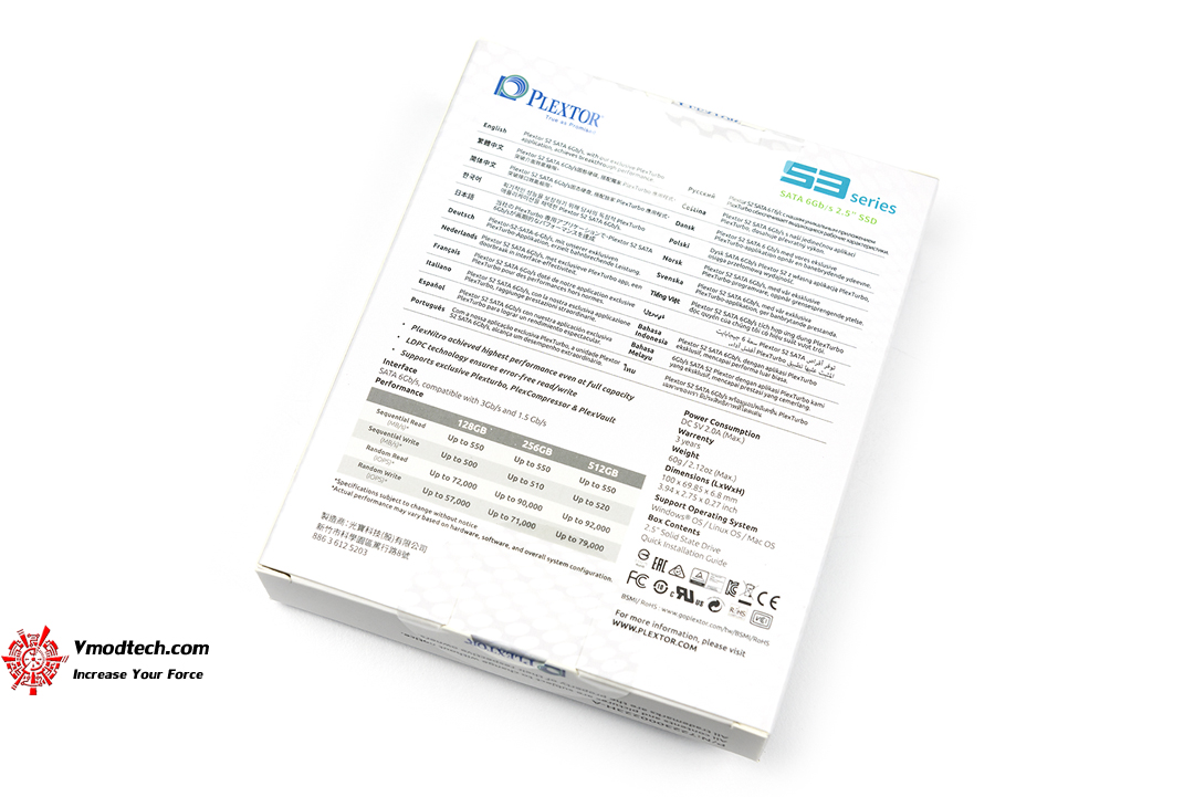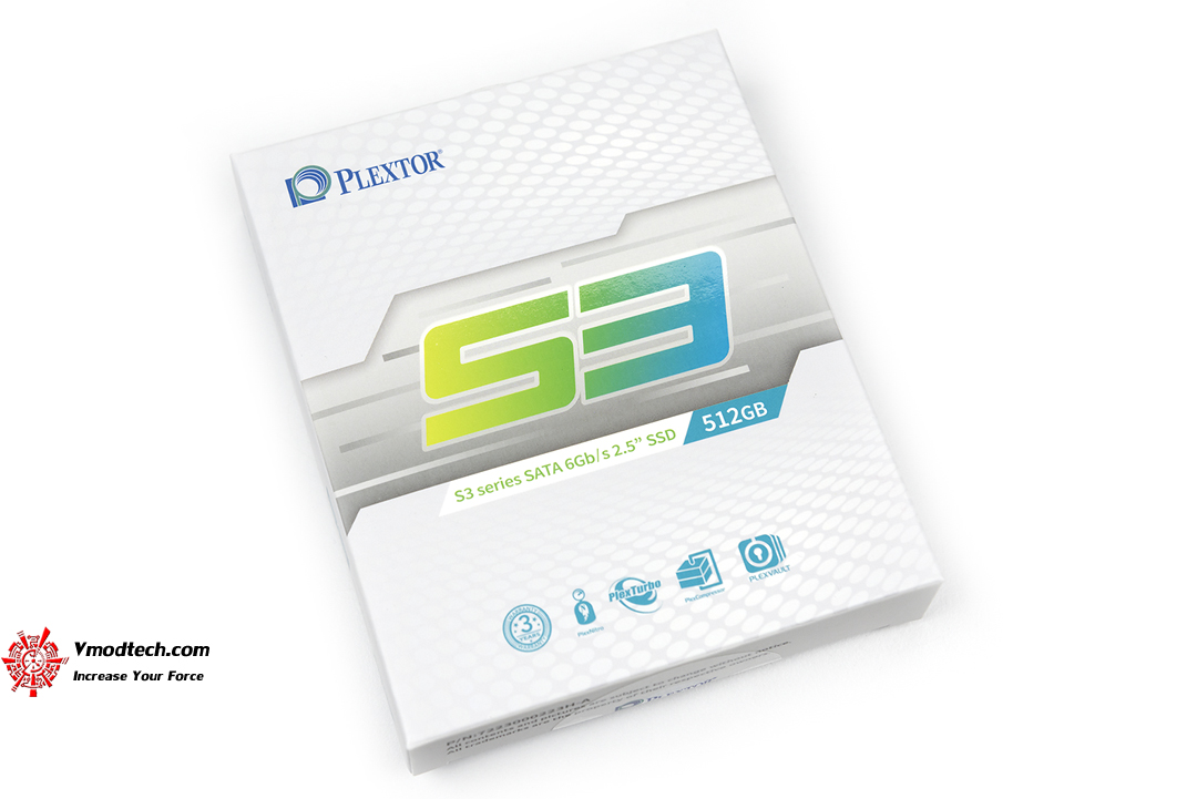 แพกเกจ PLEXTOR PX-512S3C SATA SSD 512GB นั้นมาแบบเรียบง่าด้วยโทนสีขาวสะอาดตา รายละเอียดของตัว SSD ได้กล่าวถึงไว้ที่ด้านหลังกล่อง