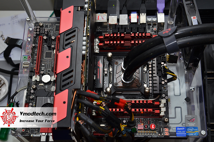 ภาพขณะทำการทดสอบ การ์ดนั้นใหญ่โตจนบอร์ดของผมผู้ทดสอบเล็กไปดูถนัดตา ไฟที่ท้ายการ์ดของ PowerColor DEVIL13 HD7990 6GB สวยงามจริงๆนะเนี่ย