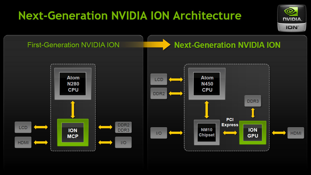 เหตผลที่ผู้เขียนเดาเอาเองง่ายๆนั้นก็คือ แพลตฟอร์มใหม่ของ Intel Atom Pineview นั้นมีการวางระบบให้มีส่วนประกอบที่น้อยลง ตัวซีพียูเองก็ติดตั้งเมมโมรีคอนโทรลเลอร์ และกราฟฟิคไปในตัวอยู่แล้ว ตัวชิป ION ก็เลยถูกลดบทบาทหน้าที่ลงไป แต่ยังคงไว้ซึ่งชิปเซ็ตเดิมของ Intel NM10 ไว้ให้สามารถทำงานติดต่อสื่อสารกับทั้งระบบของ Pineview ได้อยู่นั้นเอง