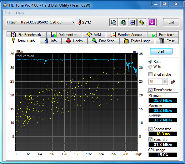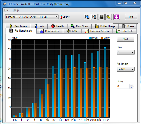 การทดสอบการอ่านนั้น ก็เป็นไปตามคาดครับ กราฟออกมาไม่เกิน 33mb/s เนื่องมาจากคอขวดของอินเตอร์เฟส USB 2.0 แต่สิ่งที่น่าสนใจคือ Access Time นั้นทำออกมาได้ดีกว่า Hitachi รุ่น X320 ที่เราได้เคยทดสอบไปก่อนหน้านี้อยู่พอสมควรเลยทีเดียว