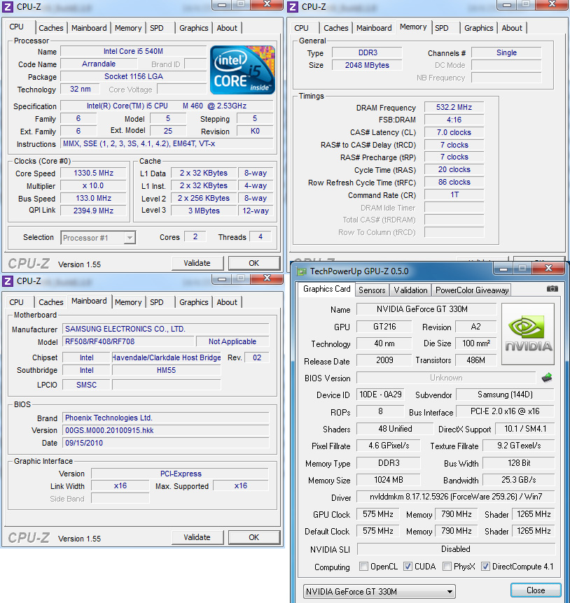 ในภาพนี้ CPUZ อ่านชื่อ CPU ผิดไปเล็กน้อย เพราะความละม้ายคล้ายคลึงกันระหว่าง i5 540 กับ 460 ที่มี clockspeed และ cache เท่ากันทุกประการ ต่างกันก็แต่ฟีเจอร์เล็กๆน้อยๆในตัวซีพียูเท่านั้นเองครับ