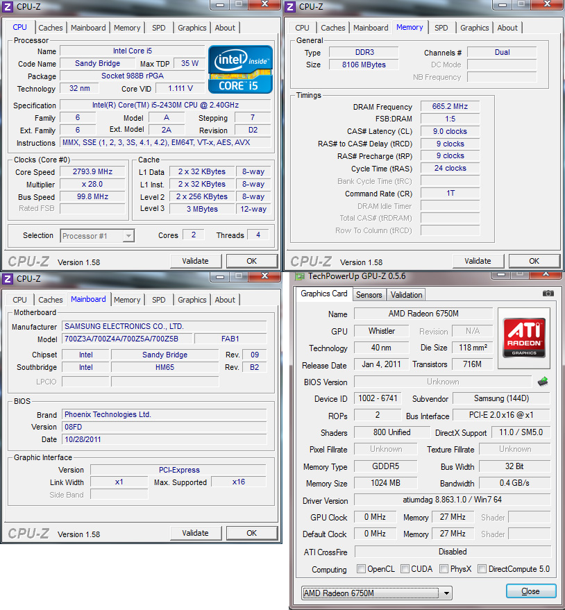 รายละเอียดจากโปรแกรม CPUZ และ GPUZ ซึ่งจริงๆแล้วเนี่ยตัวกราฟฟิคชิป HD6750M สามารถสลับโหมดไปใช้งานชิปภายในตัวซีพียูของ Intel เพื่อประหยัดพลังงานได้อีกด้วยครับ