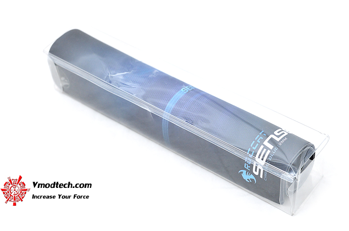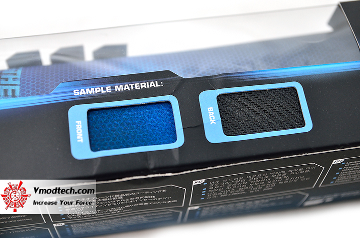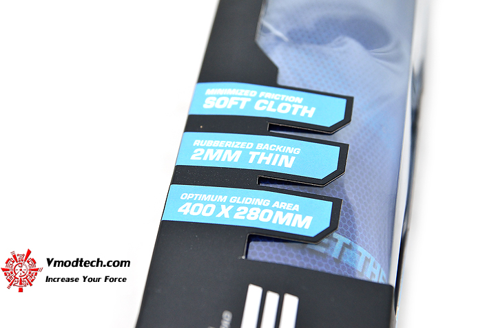 ตรงด้านข้างกล่องจะบอกรายละเอียดไว้พอควร คือ Mousepad นี่มีความฝืดต่ำประมาณว่าเป็นแบบ Speed นั่นเอง ความหนาสองมิลลิเมตรและมีแผ่นยางด้านหลัง ตัว mousepad จะมีขนาด 400 x 280 มิลลิเมตร
