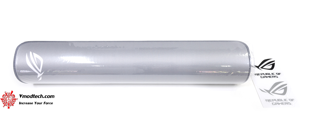 ภายในกล่องนั้นก็จะมีแผ่นรองเมาส์และสติ๊กเกอร์โลโก้ ROG มาให้ด้วย