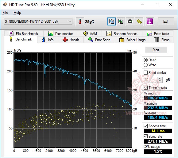 ประสิทธิภาพของการอ่านโดย HD Tune นั้นถือว่าสูงมากครับในระดับ 185.4 MB/s โดยเฉลี่ย