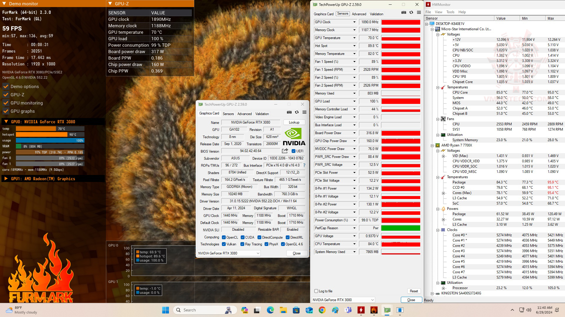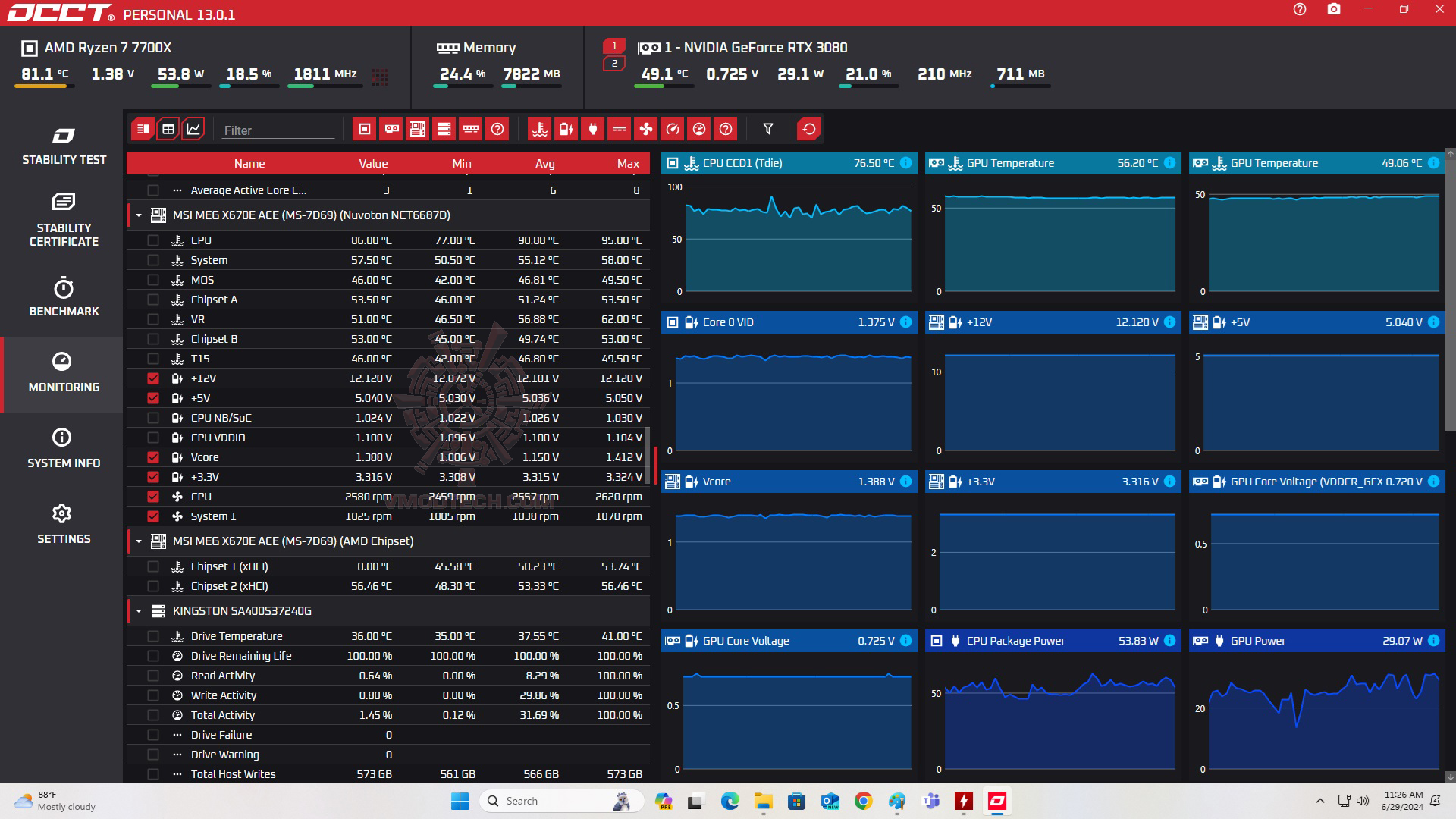 Furmark ทดสอบกัน 8นาทีเต็มโหลดเต็มที่ ระบบจ่ายไฟ GPU ก็ทำได้นิ่งเยี่ยมครับ ภาคจ่ายไฟ 12V อยู่ที่ 12.1V ในช่องขั้วต่อที่1 และ 12.2 ในช่องขั้วต่อที่2 จ่ายไฟได้นิ่งดีเลยครับกับประสิทธิภาพการทำงานที่โหลดกันแบบหนักๆ ทำงาน 100% เต็ม เอาการ์ดจอใบใหญ่ๆ อย่าง ASUS TUF GAMING RTX 3080 รุ่นใหญ่ได้สบายๆ กับภาคจ่ายไฟ 12V รางเดี่ยว 70A จ่ายไฟได้นิ่งเยี่ยมมากๆ ครับ