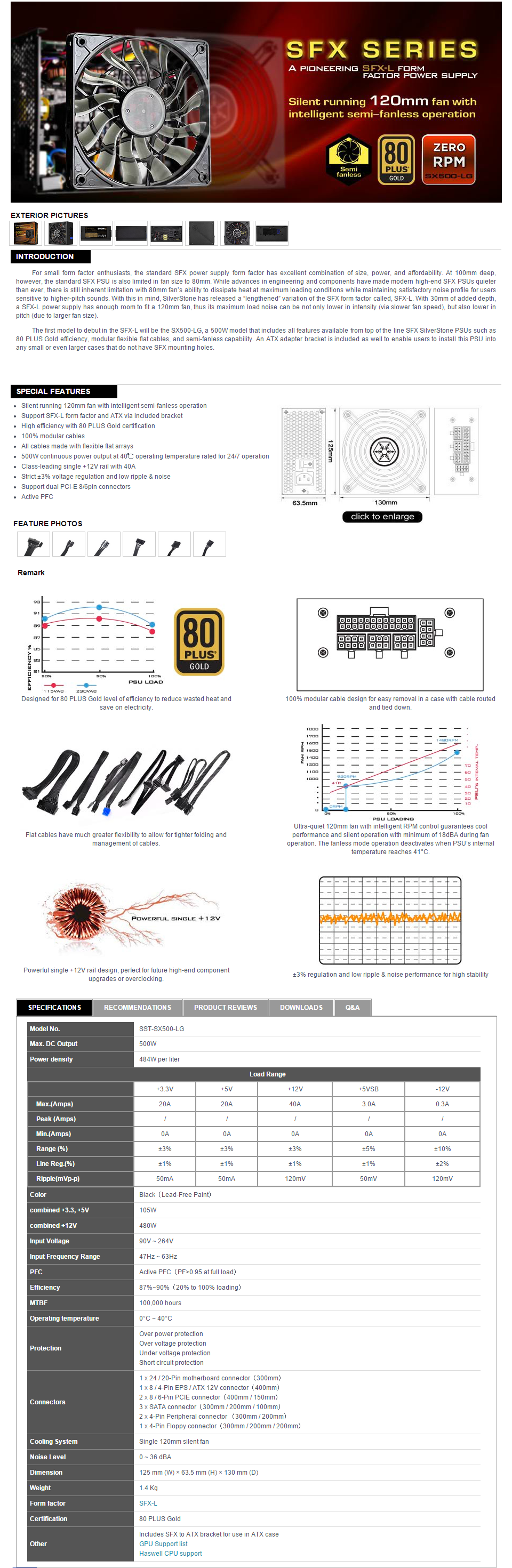 ..........สวัสดีวันนี้มี Power Supply ขนาด SFX-L Form factor มาเอาใจท่านที่ชอบอะไรที่เล็กๆจิ๋วๆกันอีกแล้วครับ กับ Silverstone SFX Series SX500-LG ซึ่งเป็น Power Supply ขนาด 500 Watt การันตีด้วย 80 PLUS® Gold กำลังไฟนั้นต้องบอกว่าเอากราฟิกการ์ดรุ่นใหญ่ๆแบบใบเดียวอยู่แน่นอนครับ และด้วยเป็น SFX-L Form factor ที่หาได้ยากในเมืองไทย จึงน่าจะโดนใจขา DIY ที่ขอบแต่งเคสขนาดจิ๋วกันนะครันวันนี้ เพื่อไม่ให้เป็นการเสียเวลาไปลุยกันเลยดีกว่า แต่ก่อนอื่นไปชมรายละเอียดจากเว็บไซต์ผู้ผลิตกันก่อนครับ