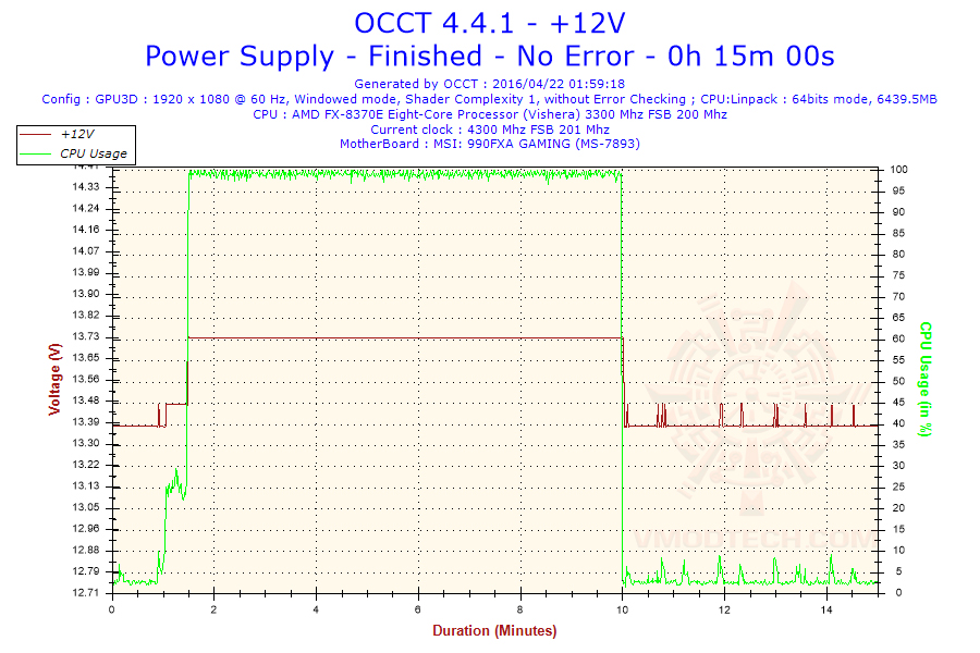 ไฟ +12V โปรแกรมดูแล้วผลแสดงออกมานิ่งเยี่ยมเลยทีเดียวครับในสถานะฟูลโหลดโดยค่าเบี่ยงเบนไม่มีเลยครับ อยู่ที่ 13.73v ซึ่งก็เกิน 12V มาพอสมควรเผื่อไว้สำหรับบรรดาอุปกรณ์แรงๆหรือเน้นการโอเวอร์คล๊อกเป็นหลักนั่นเองครับอันนี้แทบไม่ต่างจากรุ่น 800W เลยครับ ส่วนสถานะไอเดิลก็มีขยับขึ้นลงบ้างเล็กๆน้อยๆครับอยู่ที่ประมาณ 13.39V ถึง 13.48V ครับ ถือว่าทำได้ดีเยี่ยมมากๆครับ ดูแล้วภาคจ่ายไฟแทบจะวิ่งตรงกันเป๊ะๆเลยครับกับรุ่น 800W นิ่งเยี่ยมมากๆ