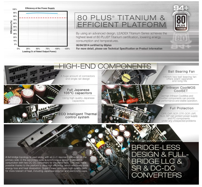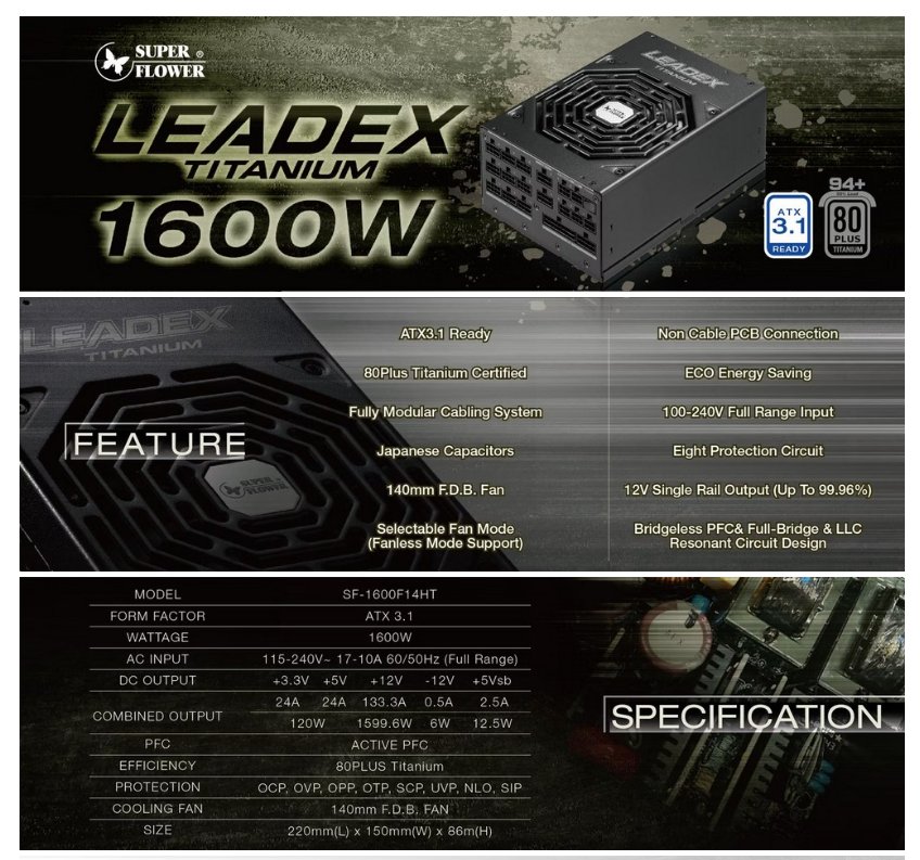 SuperFlower LEADEX Titanium 1600W 80 PLUS Titanium ด้วยความจุ 1600W ขนาด ATX 3.1 มาตรฐาน 80 PLUS PLATINUM กับค่า Efficiency มากถึง 94% สูงสุด แบบรางเดี่ยว สามารถถอดสายได้ 100% fully modular cable รองรับการใช้งานทั่วไปพร้อมมาตรฐานระดับสูงพร้อมวัสดุเกรดพรีเมี่ยมทั้งคาปาซิเตอร์เกรดญี่ปุ่นพร้อมระบบป้องกันอันตราย 8จุดกันเลยทีเดียว