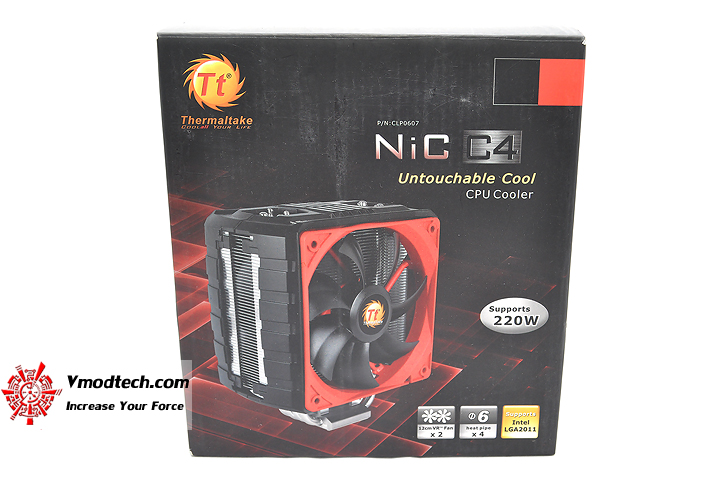 มากันในกล่องสีดำสนิทสลับสีแดงของพัดลมพร้อมบอกชื่อรุ่นและรองรับการทำงานซีพียู TDP 220W
