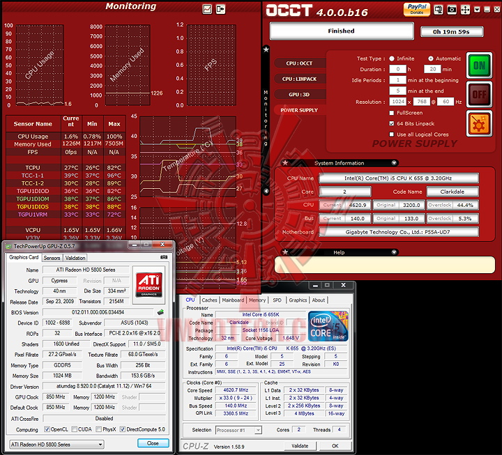 dsc_2219จัดชุดเทสด้วย i5 655K กับ HIS HD5870 กันครับ โดยที่ CPU จะมีการ Overclock ไปที่ประมาณ 4.6 GHz ด้วยไฟ CPU ที่มากกว่าปกติสาม-สี่เคาะตอนที่ตั้งใน Bios เพื่อให้ระบบดึงไฟจาก PSU มากกว่าปกติ รวมถึงตั้งเป็นมาตรฐานสำหรับเทส Heat Sink ไปด้วยในตัวครับ