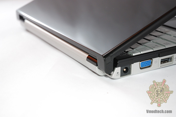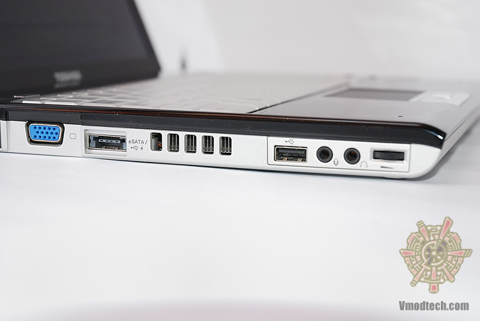 ผมเคยรีวิวโน๊ตบุ๊กรุ่น Qosmio X300 ไป ซึ่งก็มีพอร์ตลักษณะนี้ เป็น Combo port ครับ คือเป็นทั้งพอร์ต eSATA และ USB ในตัว (เอาอะไรมาเสียบก็ได้อย่างนั้น) ส่วนท่เหลือก็เป็น VGA out (DSUB) ยูเอสบี อีกหนึ่งพอร์ต รวมไปแจ๊กเฮดโฟน และปุ่มเลื่อนปรับโวลุ่ม เอกลักษณ์เฉพาะของโน๊ตบุ๊กจากค่ายนี้เขาแหละครับ