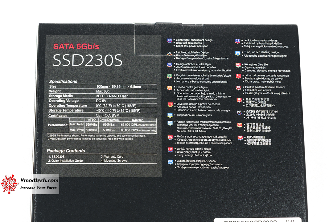 แพกเกจ Transcend SSD230S 256GB นั้นมาแบบง่ายๆครับเหมือนเคย โทนสีของตัวกล่องนั้นจะเป็นสีขาวคลิบสีแดงด้านล่าง ส่วนด้านหลังกล่องมีอธิบายรายละเอียดของตัว SSD ไว้พอสมควร