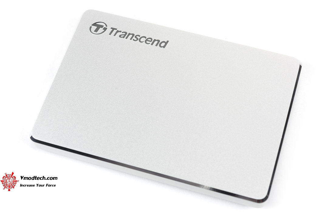 หน้าตาเต็มๆของ StoreJet 25C3S 1.0TB จะมีตัวถังเป็นสีเงินแวววาว วัสดุนั้นทำมาจากอลูมิเนียม ขนาดกว้างยาวนั้นใกล้เคียงกับ SSD แต่จะหนากว่าที่ 9.95 มิลลิเมตร