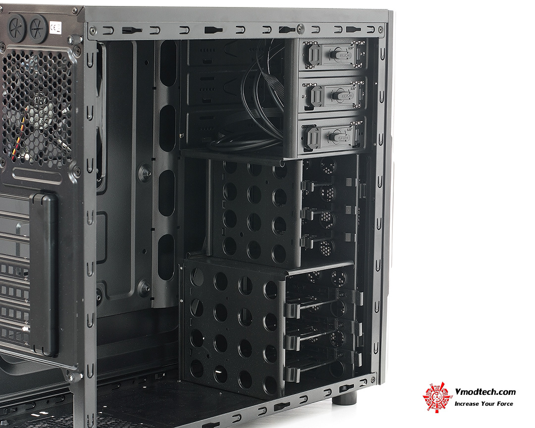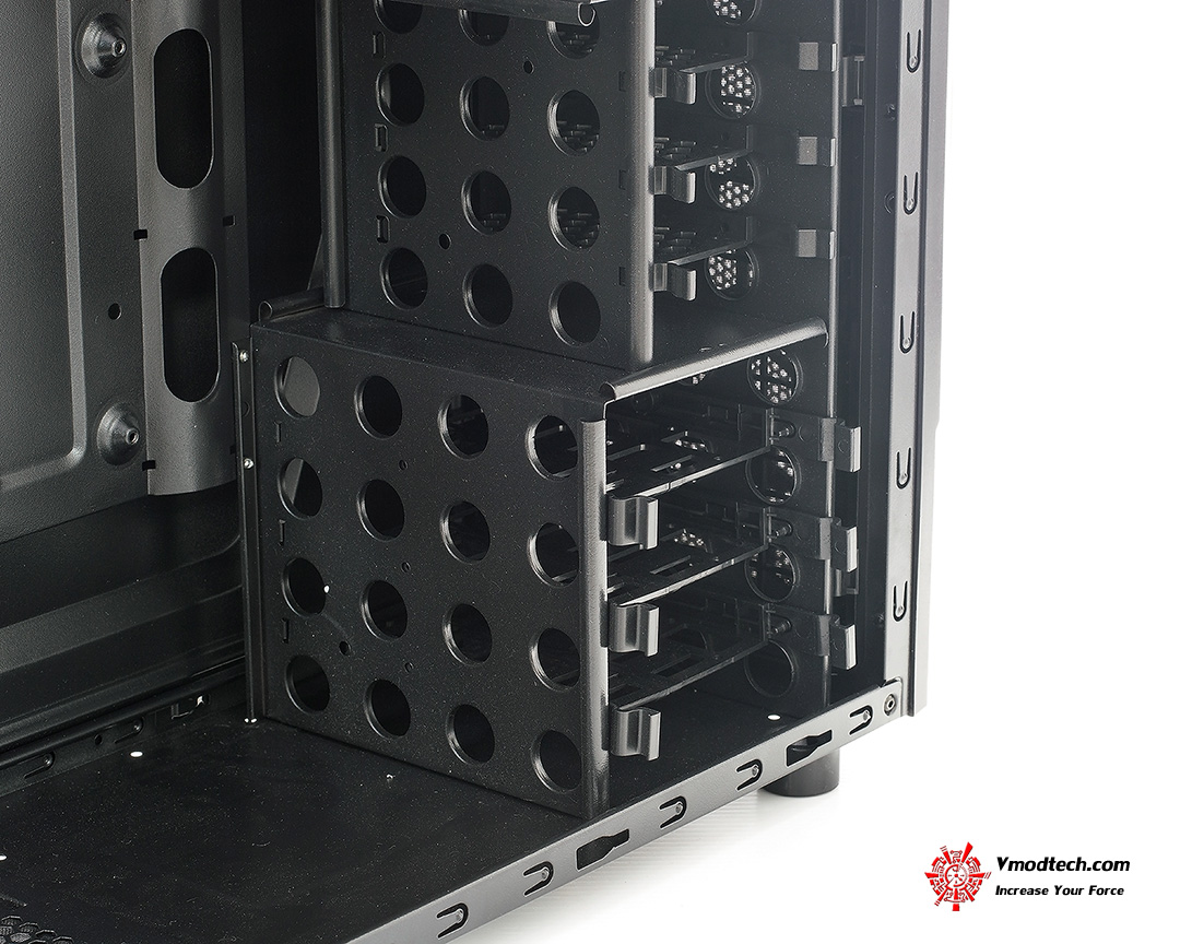 ถัดลงมาตรงนี้ก็เป็นช่องระบายความร้อนครับ ภายในสามารถติดตั้งพัดลม 120 mm. ได้ 2 ตัว เป่าลมเย็นผ่าน HDD เข้าระบบ