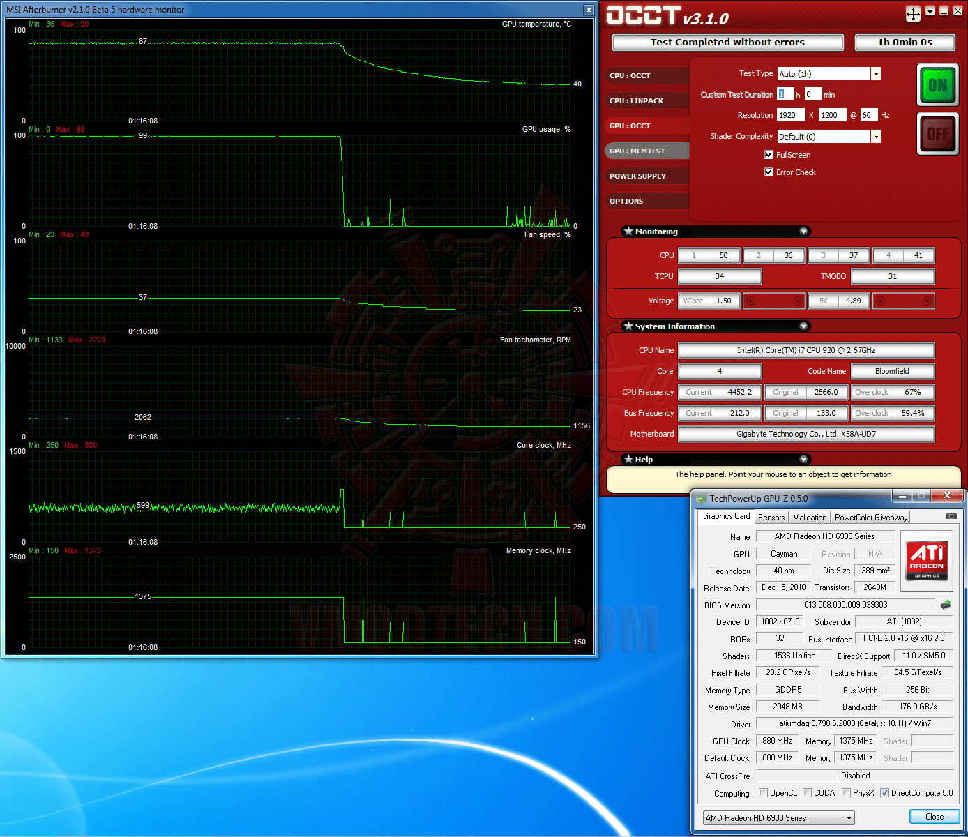 ...ส่วนรูปแบบสุดท้ายก็คือการเทสต์ที่ความเร็วเดิมๆของ HD 6970 BIOS ที่ 880/5,500MHz หลังจากที่แฟลชแปลงร่างเป็น HD 6970 แบบสมบูรณ์แล้วโดยไม่มีการปรับแต่งเพิ่มลดค่าใดๆ ซึ่งที่ค่าความเร็วที่เห็นนี้ ผมเห็นแล้วก็อดสงสัยไม่ได้เลยครับว่ามันจะเสถียรจริงหรือไม่ จะเทสต์แต่ 3DMark ก็ไม่แน่ใจ แบบนี้ต้องจัดชุดใหญ่ไปด้วย OCCT หัวข้อ GPU : OCCT 1ชั่วโมงเต็ม โดยไม่ปรับพัดลมรอบสูงๆช่วยแต่อย่างใด AUTO กันล้วนๆ ไปดูกันครับว่าผลมันจะออกมาเป็นเช่นไร