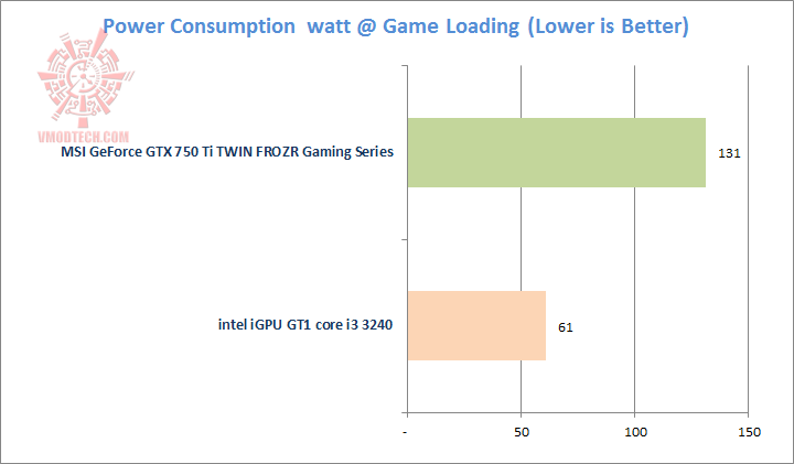 เปรียบเทียบอัตราการเรียกใช้ไฟจากเต้ารับของชุดเอเอ็มดี 5800K เมื่อรันเกมส์ด้วย iGPU และเมื่ออัพเกรดด้วยการ์ด NVIDIA GeForce GTX 750 Ti เข้าไป แม้ว่าอัตราการใช้ไฟจะสูงขึ้นเป็นเท่าตัวแต่ทว่าหากมองดูดีๆแล้วที่ 131 วัตต์นี่ถือว่าประหยัดไฟมากครับ