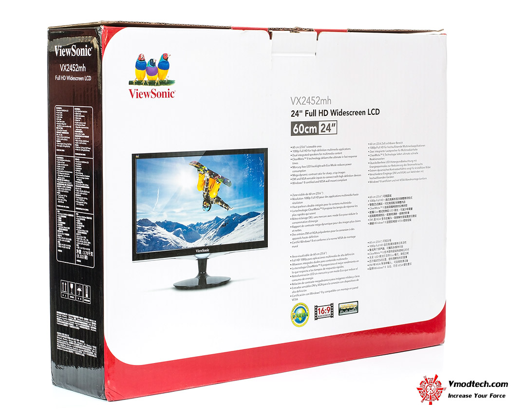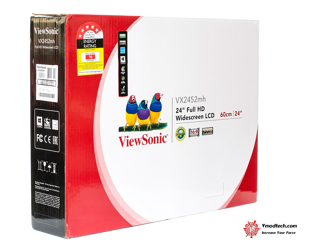 ViewSonic VX2452mh จะบรรจุอยู่ในกล่อง ขาว-แดง-ดำ ตรานกแก้ว 3 ตัวตามภาพครับ
