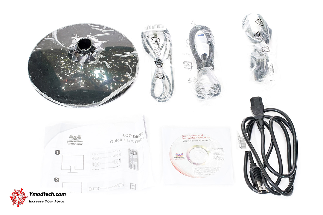 แกะกล่องออกมาก็พบ Power Cable 1 ชุด, VGA Cable 1 เส้น, Audio Cable 1 เส้น, DVI Cable 1 เส้น, ฐานหรือขาตั้ง 1 ชิ้น, คู่มือ และ แผ่นไดร์เวอร์ ครับ