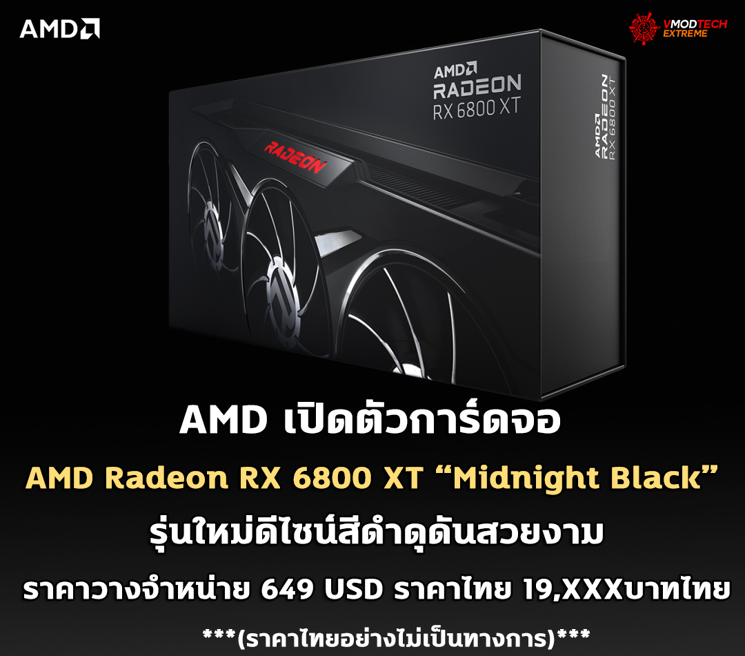 วันนี้ก็มีข่าวจากฝั่ง AMD ออกมาให้เราได้ชมกันครับกับการเปิดตัวการ์ดจอ AMD Radeon RX 6800 XT ในรุ่น “Midnight Black” ที่มีดีไซน์สีดำดุดันสวยงาม ซึ่งการ์ดจอ RX 6800XT กับชิปเซ็ต Navi 21 XT GPU มีจำนวนคอร์ 4608 Stream Processors. แรมขนาดความจุ 16GB of GDDR6 memory และแคช 128MB of Infinity Cache. ตัวการ์ดมีขนาด a 2.5-slot design มีช่องต่อไฟเลี้ยง dual 8-pin กินไฟประมาณ 300W ราคาวางจำหน่ายประมาณ 649 USD คาดเริ่มวางจำหน่ายเร็วๆ นี้