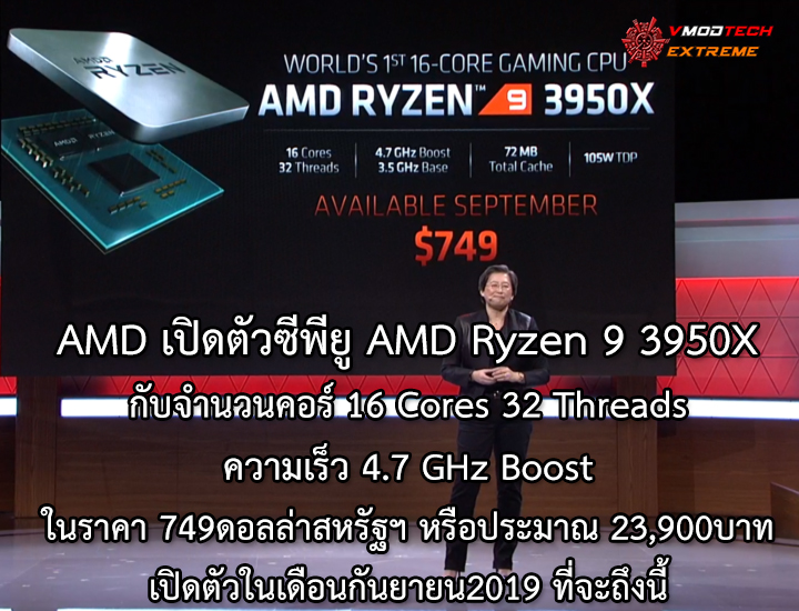 AMD เปิดตัวซีพียู AMD Ryzen 9 3950X กับจำนวนคอร์ 16 Cores 32 Threads ความเร็ว 4.7 GHz Boost ในราคา 749ดอลล่าสหรัฐฯในเดือนกันยายน2019 ที่จะถึงนี้