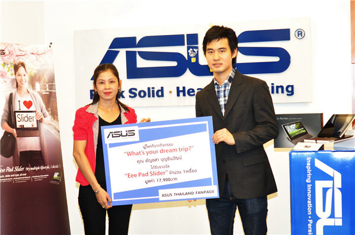 จากภาพ นายสิทธิชัย รุจิเกียรติขจร ผู้จัดการฝ่ายผลิตภัณฑ์ บริษัท อัสซุสเทค คอมพิวเตอร์ (ประเทศไทย) จำกัด มอบรางวัล "E-Pad Slider" แท็บเล็ตรุ่นล่าสุดจากเอซุส มูลค่า 17,900 บาท ให้แก่ คุณอัญชสา บุญชินวัฒน์ ผู้โชคดีจากการเข้าร่วมสนุกเล่นเกมส์ตอบคำถามผ่านwww.facebook.com/ASUSThailand กับแคมเปญ "Your Dream Trip" ณ บริษัท อัสซุสเทค คอมพิวเตอร์ (ประเทศไทย) จำกัด ตึก Q HOUSE